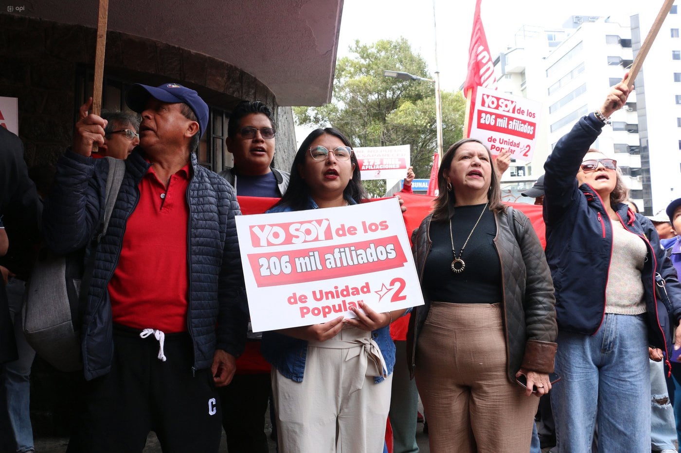 Con gritos, pancartas y personas pegadas con cinta adhesiva a postes y árboles, la mañana de este martes, 31 de marzo, integrantes del movimiento Unidad Popular (lista 2) se ubicaron en los exteriores del Consejo Nacional Electoral (CNE), en el norte de Quito, para rechazar la resolución con la cual se inició el proceso de cancelación de la organización política.